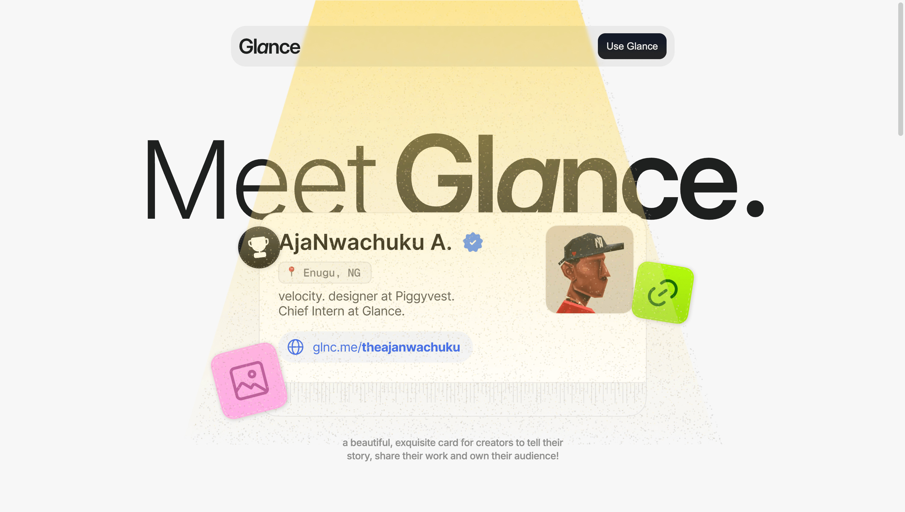 A beautiful, exquisite card for creators and builders to tell their story, share their work and own their audience!